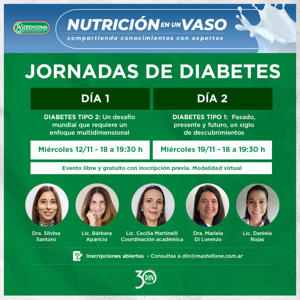 Las Jornadas de Diabetes 2025 impulsadas por Mastellone Hnos., a través de su Departamento de Información Nutricional (DIN), tendrán lugar los días miércoles 12 y 19 de noviembre en modalidad virtual y gratuita, con inscripción previa. El ciclo, enmarcado en el Día Mundial de la Diabetes, busca promover la educación en salud y nutrición entre profesionales y estudiantes.
