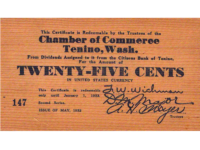 Durante los largos años de la Gran Depresión en Estados Unidos, el pueblo de Tenino concitó la atención de todo el país cuando imprimió miles de dólares de madera para mantener a flote su economía. Ahora que enfrenta lo que podría ser la peor caída económica desde aquella época el concejo municipal aprobó una ordenanza autorizando la impresión de certificados de manera por un valor de hasta US$ 10.000.