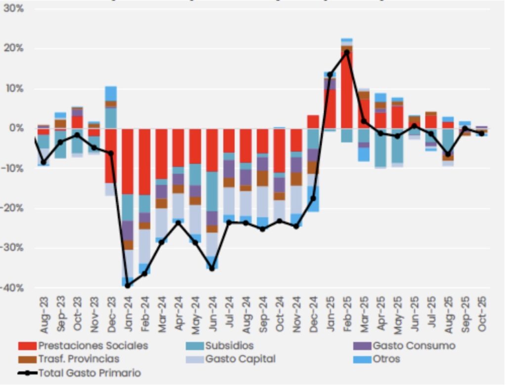 Dos rubros completan el cuadro de “ajuste persistente”. Las transferencias corrientes a provincias volvieron a caer 29% real interanual en octubre, con un flujo sostenido principalmente por partidas asociadas a alfabetización, mientras otras transferencias se discontinuaron o se redujeron.