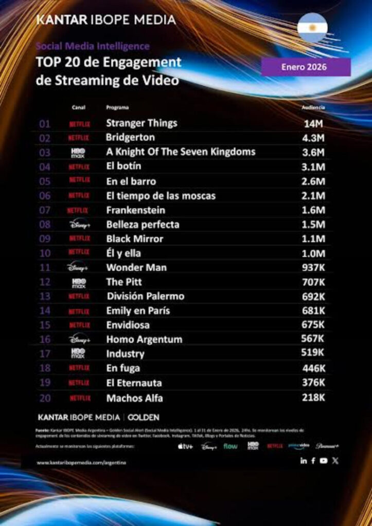 El ranking de contenidos de streaming con mayor engagement en redes sociales durante enero ubicó a “Stranger Things” (Netflix) en el primer puesto, tras...