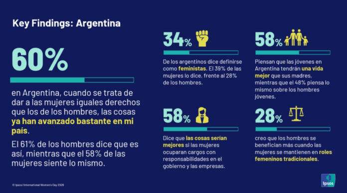 En Argentina, el 60% de las personas considera que se avanzó lo suficiente en igualdad de derechos, por encima del promedio global (52%). “En Argentina, el 60% de las personas considera que se ha avanzado lo suficiente en materia de igualdad de derechos entre hombres y mujeres”, dijo Martín Tanzariello, gerente de Marketing y Comunicación en Ipsos Argentina. Ese indicador creció 9 puntos porcentuales desde 2019 y se ubicó entre los más altos de América Latina, apenas por debajo de México (66%) y Chile (65%).